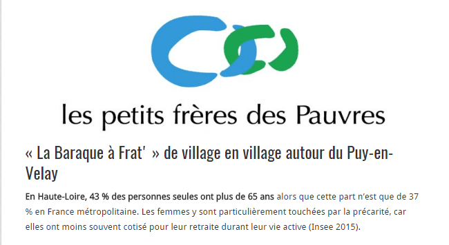 Depuis 1946, les petits frères des pauvres sont aux côtés des personnes âgées souffrant d'isolement, prioritairement les plus démunies. Les petits frères des pauvres (de) non à l'isolement de nos aînés (fr); Les petits frères des pauvres est une association caritative française, reconnue d'utilité publique.